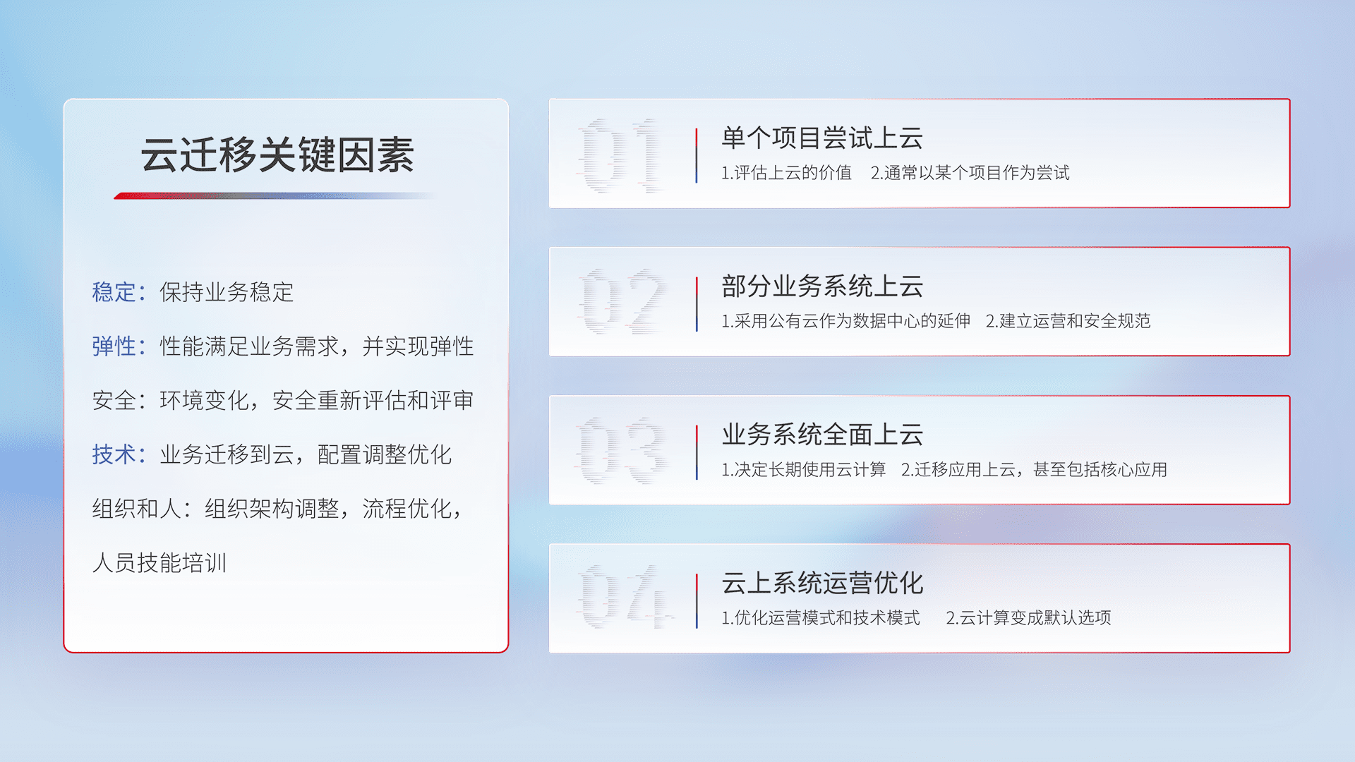 结合实际业务,,从规划设计、、、、云平台选型、、云原生改造、、、、数据迁移、、、、集成交付,,,迁移全过程为客户识别最佳上云路径,,,做好风险识别管理,,,设计网络架构、、、身份权限、、安全审计合规、、、操作审计、、、日志审计、、监控告警策略、、多站点容灾设计等,,对云上基础设施进行整体规划,,提升IT治理水平,,,,以满足弹性、、、高可用、、、、高性能的需求。。。